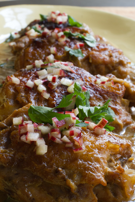 Pour the the sauce around the thighs. Sprinkle with chopped cilantro or parsley and the reserved rhubarb dice and serve.