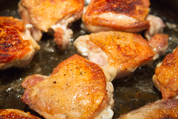 Return the chicken thighs to the pan, skin side up. Add enough stock so it reaches 1/3 of the way up the chicken. Bring to a boil, then lower the heat to a simmer, cover and cook until until a knife easily slips the meat off the bone, about fifty minutes.