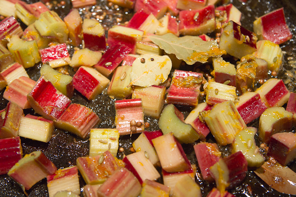 Toss the large rhubarb pieces with the brown sugar, fennel and coriander seeds, bay leaves, orange zest and juice. Give everything a good stir and allow the rhubarb to macerate while you prepare the chicken.