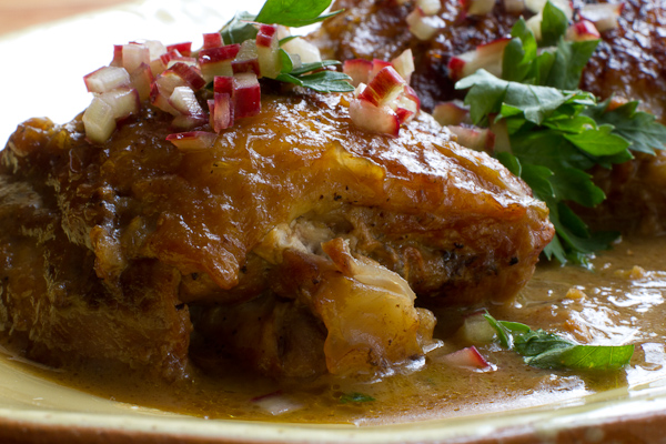 The original recipe didn’t include the rhubarb dice garnish. Again, my hands were in control. I couldn’t help myself. The thighs needed a little blush. Bear in mind that the garnish is just a visual element. Keep the dice small and use just a sprinkle, so that no one gets a mouthful of raw rhubarb, fun as this may sound.