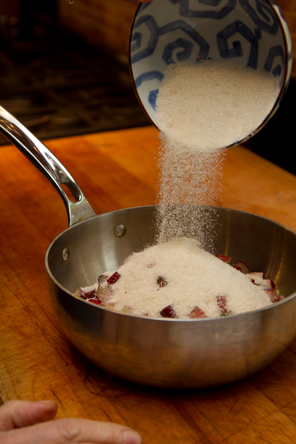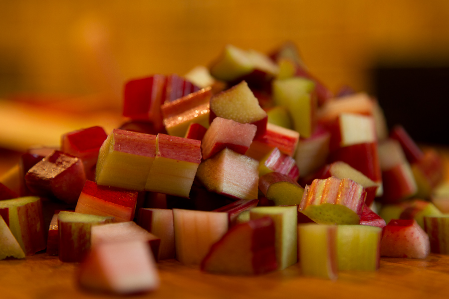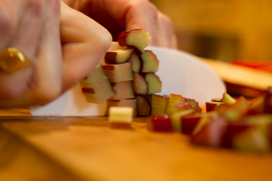 Once the strings are removed, trim the ends and cut the rhubarb stalks into ½-inch dice. You should have about 4 cups.