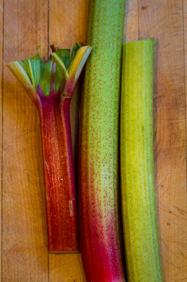 Hot house rhubarb maybe prettier than green rhubarb, but not necessarily tastier. If you’re using green rhubarb, peel the string off the stalks. Don’t bother with a vegetable peeler. Use the blade edge of a sharp paring knife to catch the strings at the end of a stalk and pull them off, much like you would with celery.