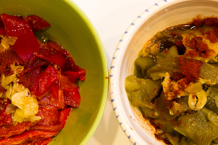 - Put green and red peppers in separate bowls. Season with a little salt and divide the garlic with its oil, both kinds of paprika, thyme, zest and juice evenly between the peppers. Toss to coat well.