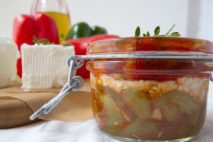 - In 4 clean dry 4-ounce crocks or glass jars, put the green peppers down as the first layer. Put a quarter of the feta on top and arrange in a flat layer. Top with the red peppers and press down with the back of a large spoon to eliminate air pockets. Top with a thyme sprig and drizzle a couple of teaspoons of olive oil over the top. Allow to set overnight in the fridge.