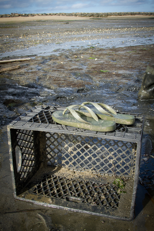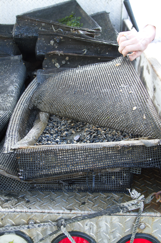 First, the basics. There are three ways to get clams–you can “scratch” them yourself, in designated intertidal areas, armed with a bucket, a clam rake and a shellfish license; you can drag for them in deeper water with a boat and a bottom dragger; or, if you’re dedicated and willing to be outdoors on days when the sun and wind can peel the skin off your face and you have to step around the spears of ice left behind by January low tide, you can raise them. Oh, and you need 2 – 3 years while they grow from chili flake seedlings to the flattened walnuts of legal size.