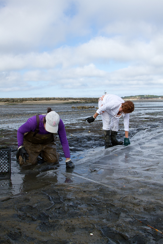 The baby clams will burrow into the mud, but during their vulnerable first year a net will protect them against moon snails, mud crabs, tautogs, and even ducks.
