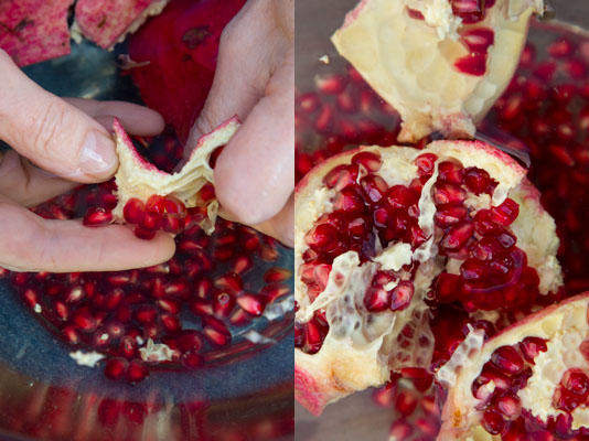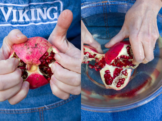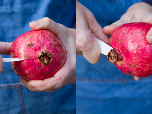 Pomegranate juice will happily stain your clothes. My own solution is to open the fruit under water. First make four shallow cuts in the skin from the calyx (the crown on top of the pomegranate) to the base. The trick is to avoid cutting through the skin into the seeds, which will release the juice. Cut out the calyx. Peel back the rind, immerse the pomegranate in a bowl of water and break the fruit into quarters. Run your fingers under the seeds to pop them off the membranes. The seeds will fall to the bottom and the membranes will float to the top. Skim and drain. No stains.