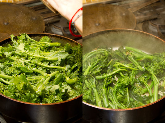 - Remove the lid. Increase the heat to high to cook off any excess water and sear the broccoli rabe slightly.