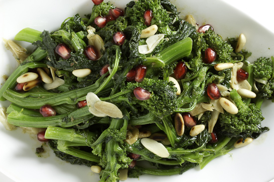 Stealing a sorceress’s vegetables makes no sense to anyone who’s not a fan of broccoli rabe’s bitter pleasures. But the rest of us have a soft spot for rabe. Broccoli rabe is never absent from the Adams-Rivard refrigerator, either as leftovers from a meal or because I’ve steamed up a bunch to put on top of my oatmeal throughout the week, along with Pecorino Romano, a soft-boiled egg and a drizzle of evoo. I’d climb into the witch’s garden for a little rapini, which brings us to this week’s recipe: Broccoli Rabe with Pine Nuts and Pomegranate.