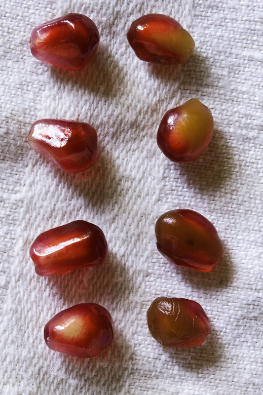 A ripe pomegranate will have a taut rich red skin and a solid feel. Its seeds will appear completely red. Clear or partially colored seeds are a sign of under-ripe fruit; brown seeds mean the fruit is turning. Avoid pomegranates with soft spots–the fruit is over-ripe–and bruised seeds (see the final photo).