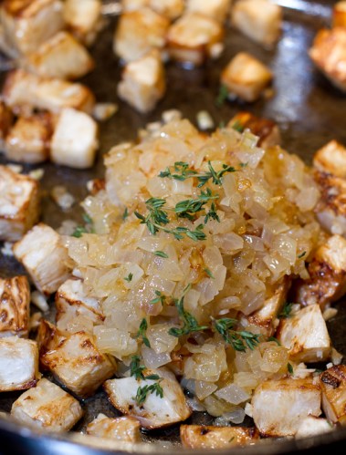 I’m so excited for this recipe. Just yesterday my co-worker gave me the celery root from his CSA — apparently his wife hates the taste — because he knew I would love it. I’ve often roasted the root and made it into soup, but never with the addition of apple, the fresh herbs and the crown of Gorgonzola. I have all the ingredients on hand except for the cheese, and I know the market will be happy to sell me some. Thank you!