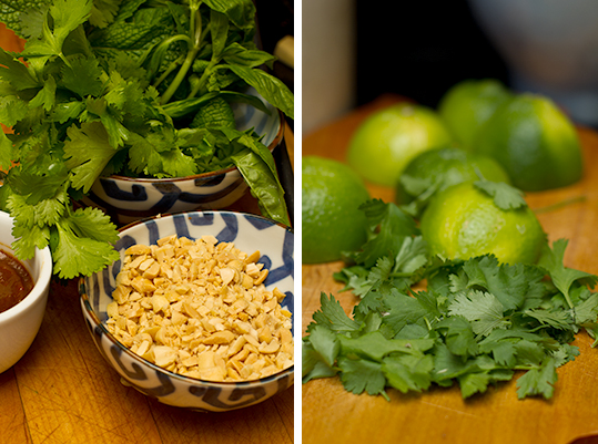While biking in Cambodia with my sisters last winter, we were given an impromptu cooking class by a woman cooking noodles at a roadside restaurant.  Easy, simple, fabulous ingredients–and delicious.  Pristine white rice noodles sitting on a basket, were dunked into a pot of simmering broth perfumed with ginger and lemon grass and then dropped into bowls.  She topped each serving with broth and vegetables.  We helped ourselves from a table of garnishes–jars of fresh herbs and bottles of hot sauce.