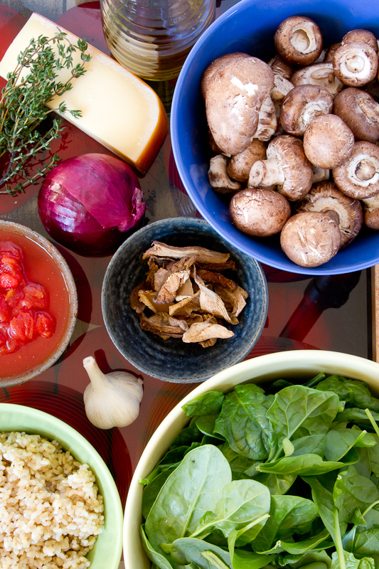 This is not a post about stuffed peppers cooked in a pressure cooker.  This week’s recipe of Stuffed Peppers with Porcini and Aged Gouda is prepared the conventional way–in the oven.  Dried porcini and their deeply infused soaking liquid meet regular mushrooms (we used cremini), spinach, tomatoes, brown rice and smoky, buttery aged Gouda in the stuffing mixture.  Humble food infused with some special aromatics and good cheese.  Stuffed peppers have a bad rap in this country–usually because they’re the indiscriminate repository of leftovers–or they’ve made by people for whom flavor is a sin.  But there’s a reason why they figure so strongly in European and Middle Eastern cuisine–they taste great.