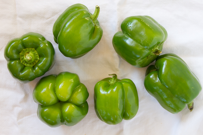 In my childhood stuffed peppers were an exotic special treat.  My mother made them with ground lamb, Mediterranean herbs and white rice, and they were always green. Red peppers were something we only saw at the end of the summer when local farmers let the green ones ripen.  Today the best peppers in the market were green, but we could just as easily have used red, yellow or orange ones had we liked them better.  Peppers grow sweeter as they ripen and, as it turns out, have a bit more of some nutrients than when they’re younger.