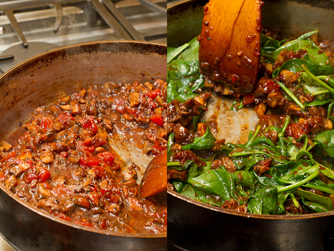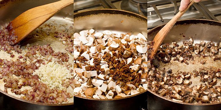3. Add the garlic, season with salt and pepper and cook until aromatic, about a minute.   Stir in the the fresh and dried mushrooms, cover and cook 3 minutes or until you hear the juices start to sizzle.