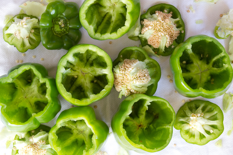 Stuffed peppers lost their allure for me when, as a college student, as I saw them at one student “dinner party” after another where the quality played a distant second to the miracle that you were being served anything at all.  A fashionable disregard for norms, including cooking norms, played a role in it, but how could people care so little about what they ate?  One glaringly bad meal stands out as emblematic.  I was invited into a dimly lit dorm room and joined the others sitting cross-legged on the floor under an Indian bedspread tented from the ceiling.  We were served peppers stuffed with sticky overcooked brown rice and some inedibly dominant herb.  I accepted a slice of hearty whole grain bread only to experience an unexpected crunch when I bit into it.  “Eggs,” our host explained.  “I made the bread with eggs.” “Crunchy eggs?”  He answered, “Whole eggs, with the shells.”  It all seems silly and funny now, but it was years before I could see a stuffed pepper without associating it with ridiculously bad student food.