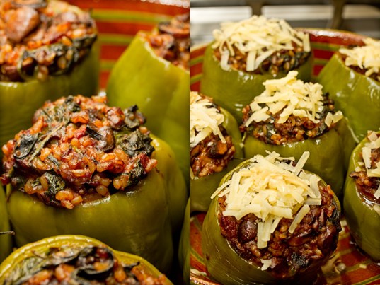 6. Cut ¼-inch off the tops of the peppers.  Scoop out the seeds and ribs.  Season the inside of the peppers with salt and pepper.  Fill the peppers with the rice mixture.  Stand them upright in a snug fitting deep-dish pan.  Add a ¼-inch of water to the pan and then cover and bake 20 minutes.  Uncover and bake an additional 20 minutes.  The peppers should be tender.  Top with the remaining cheese and cook 5 minutes to melt and brown.