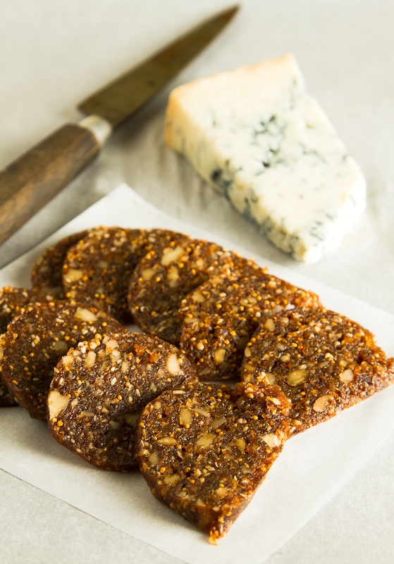 Salame di fichi is made from dried figs.  Salame di cioccolato is made from… guess what?  Despite its dolce-ness, fig salami is no sweeter than figs–and actually has a little more punch from the red wine reduction.  It makes a dynamite combination with blue cheese, and it looks great.