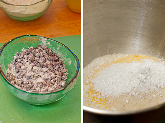 3. Spoon 2 tablespoons white flour over the currants.  Toss until currants are evenly coated with flour.  Combine the remaining dry ingredients in the bowl of a standing mixer.  Use the paddle to mix well.  Add the currants and mix again.