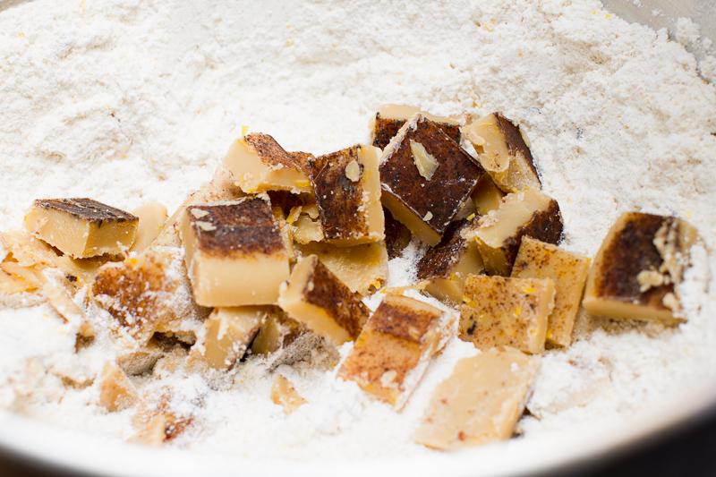4. Remove the brown butter from the freezer and pry out of the plastic container onto a cutting board.  Cut into 1/2-inch pieces. Add the brown butter to the flour mixture and mix for 1 minute or until the butter is in pea-sized pieces.