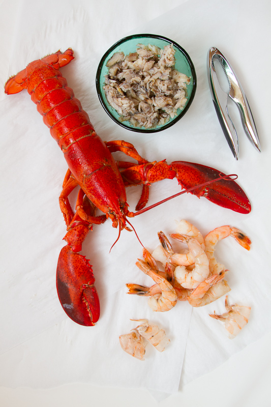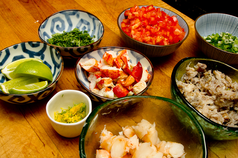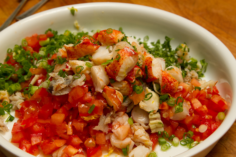 • 1 pound assorted cooked seafood, cut into 1-inch pieces (Lobster, shrimp and blue crab work well.  If you’re adventurous, add squid, clams, mussels or oysters as well.  You can even add the clams and oysters raw.)