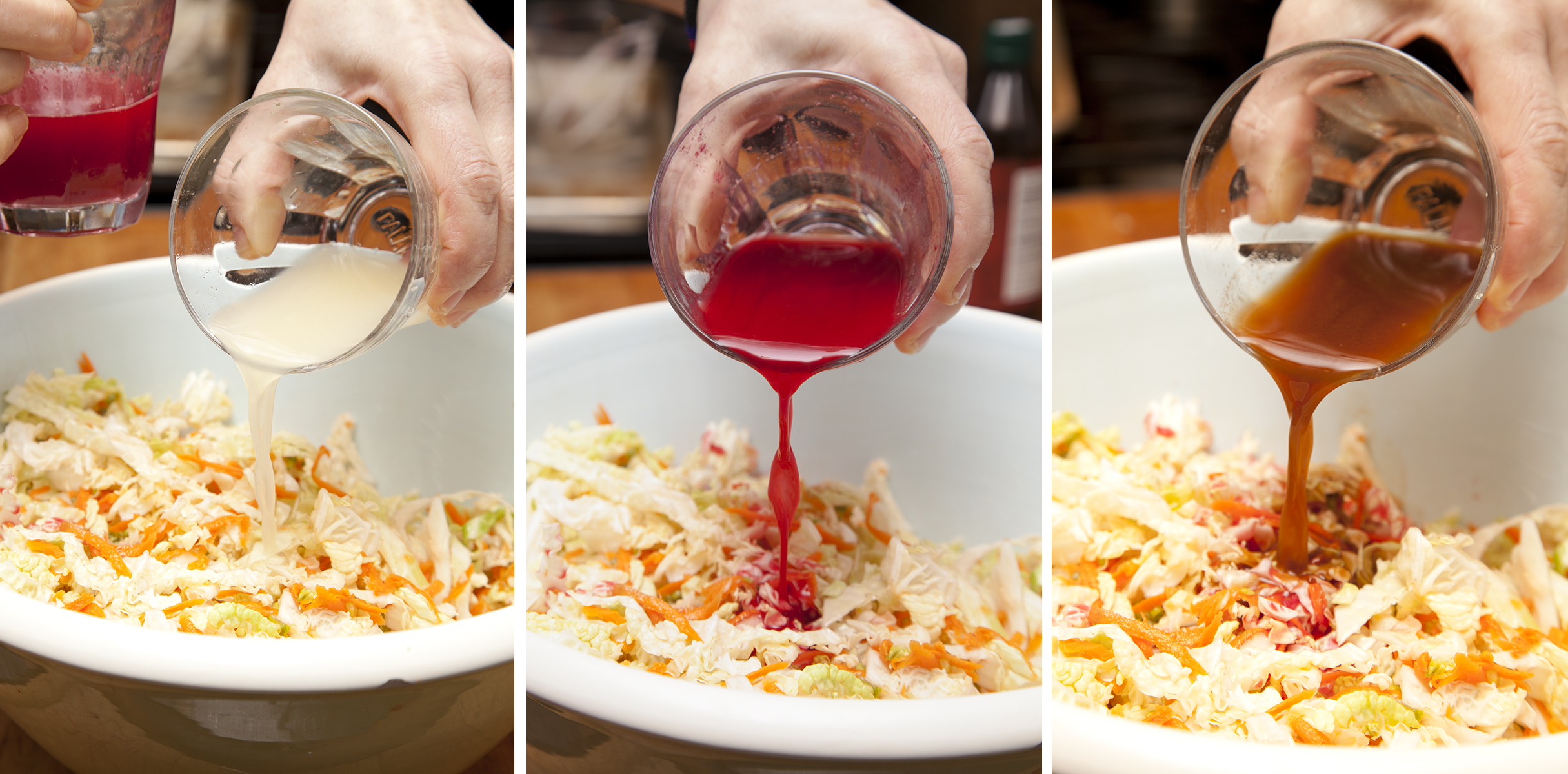 1. Mix the cabbage, carrot and onion in a large bowl. Add the salt and toss well. Allow to sit 30 minutes in a colander to drain.