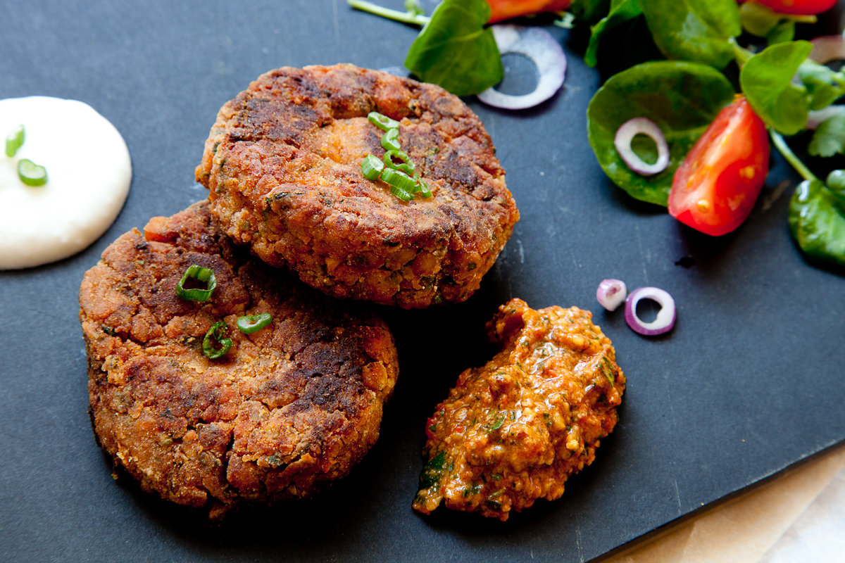 After last week’s meat-centric post of the rich 8-hour lamb, I was inspired to do something at the other end of the spectrum. These are easy, spicy, lively and fill the protein slot as a meat alternative. They’re substantial and rich in flavor so they benefit from the spicy kick of Romesco sauce, the cool fresh flavor of yogurt and a the crunch of a salad.