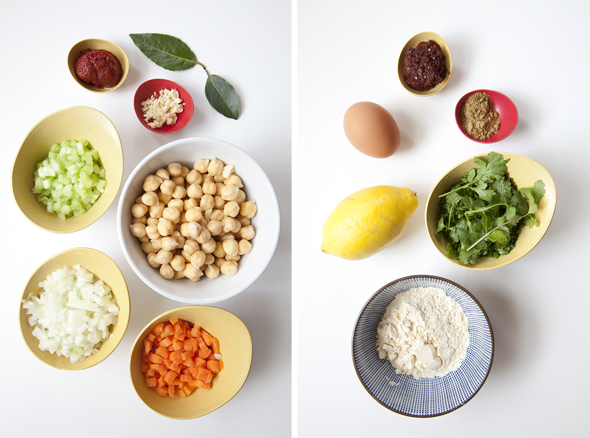 - Put the chickpeas in a food processor and pulse 3-4 times to coarsely chop. Add 2 tablespoons chickpea flour, harissa, 3 tablespoons lemon juice, parsley, cilantro and egg and pulse to just combine. If the mixture seems a little wet, add a tablespoon or two of chickpea flour.