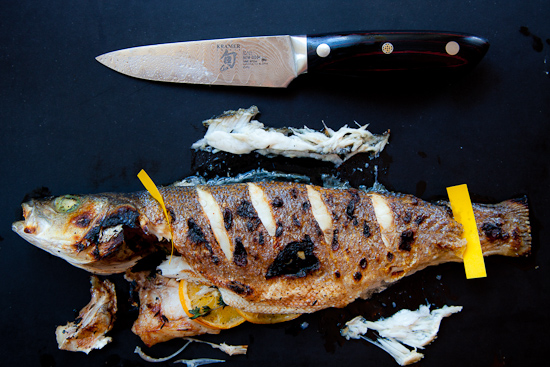 Slide the edge of a knife along the dorsal (top) ridge and pull away the remains of the top fin. Do the same for the ventral (belly) fin. Scrape away any remanats of the gills. Make two cuts (marked by yellow tape): cut through the fish near the tail; cut just down to the spine behind the head.tape