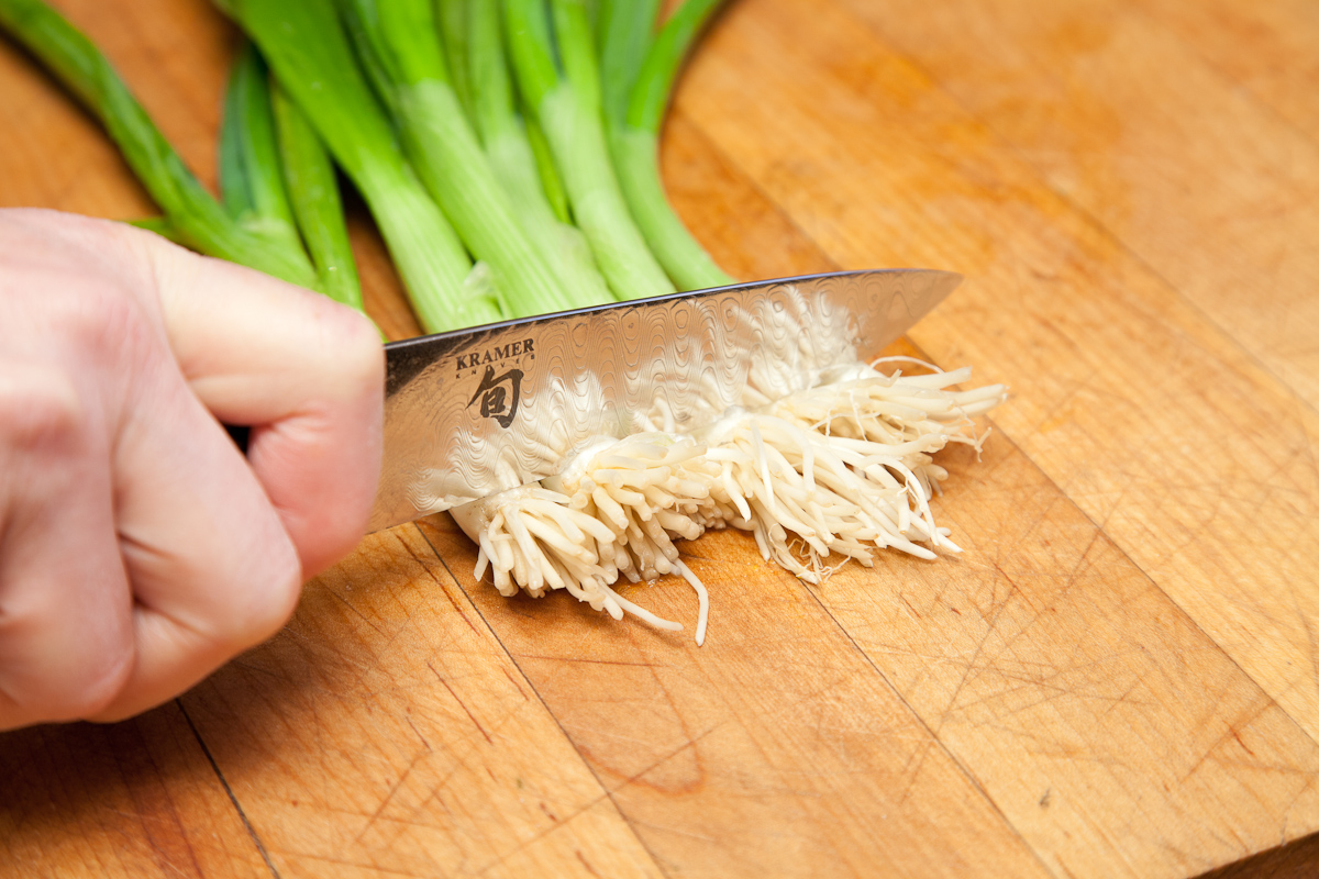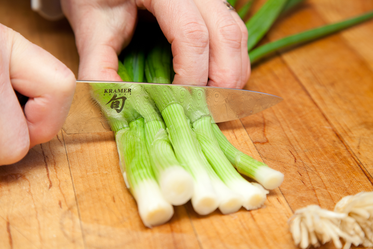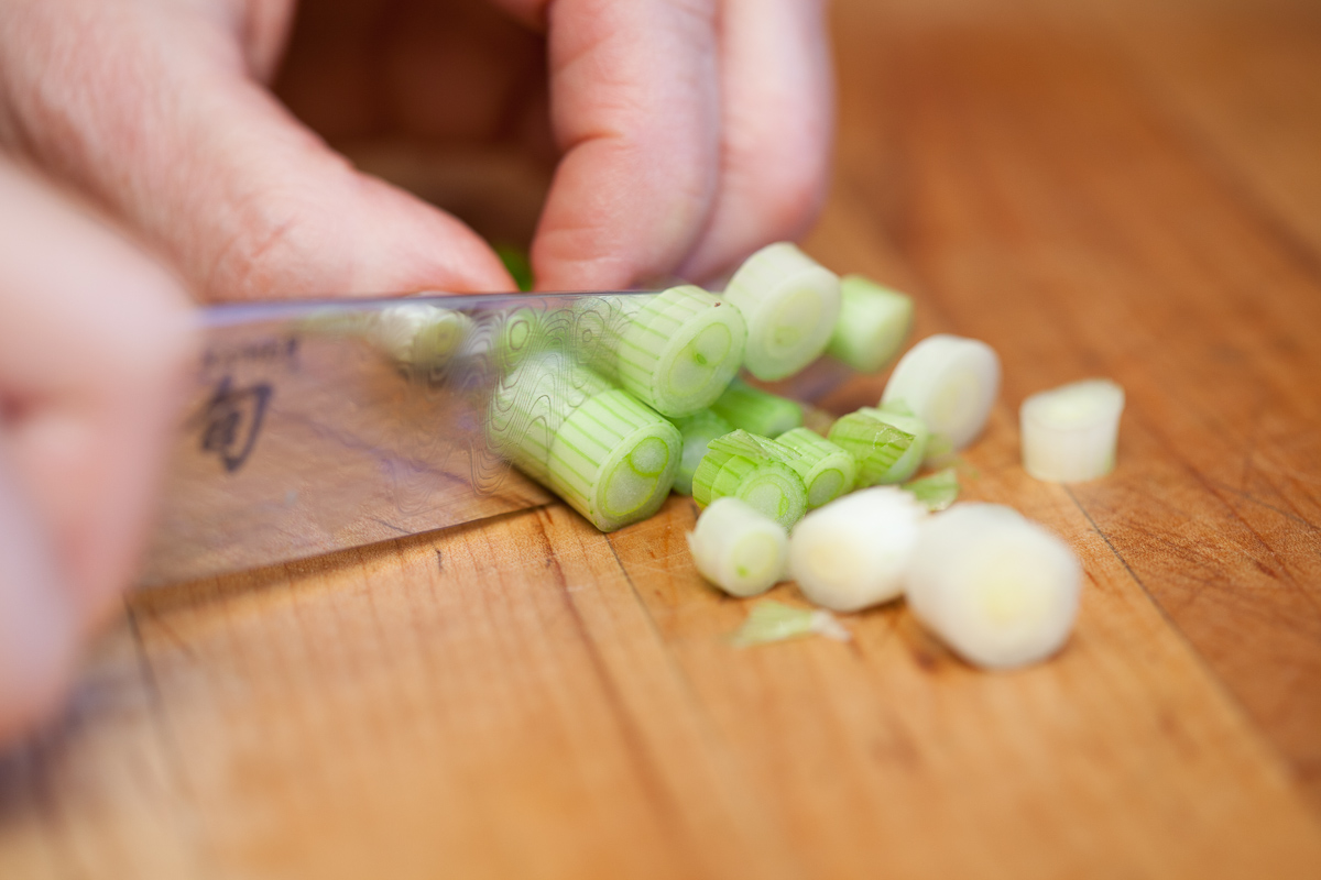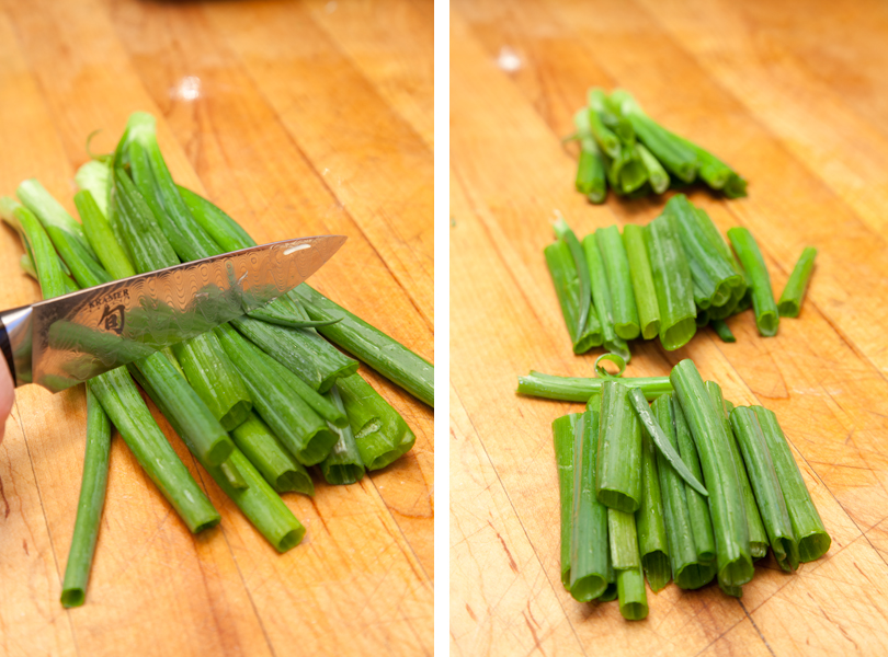 2. Trim the roots and gnarly green ends off the scallions.  Slice the white sections into ½-inch rounds.  Save the greens.  Reserve 1 bunch of the greens for pesto and the second bunch for another use.