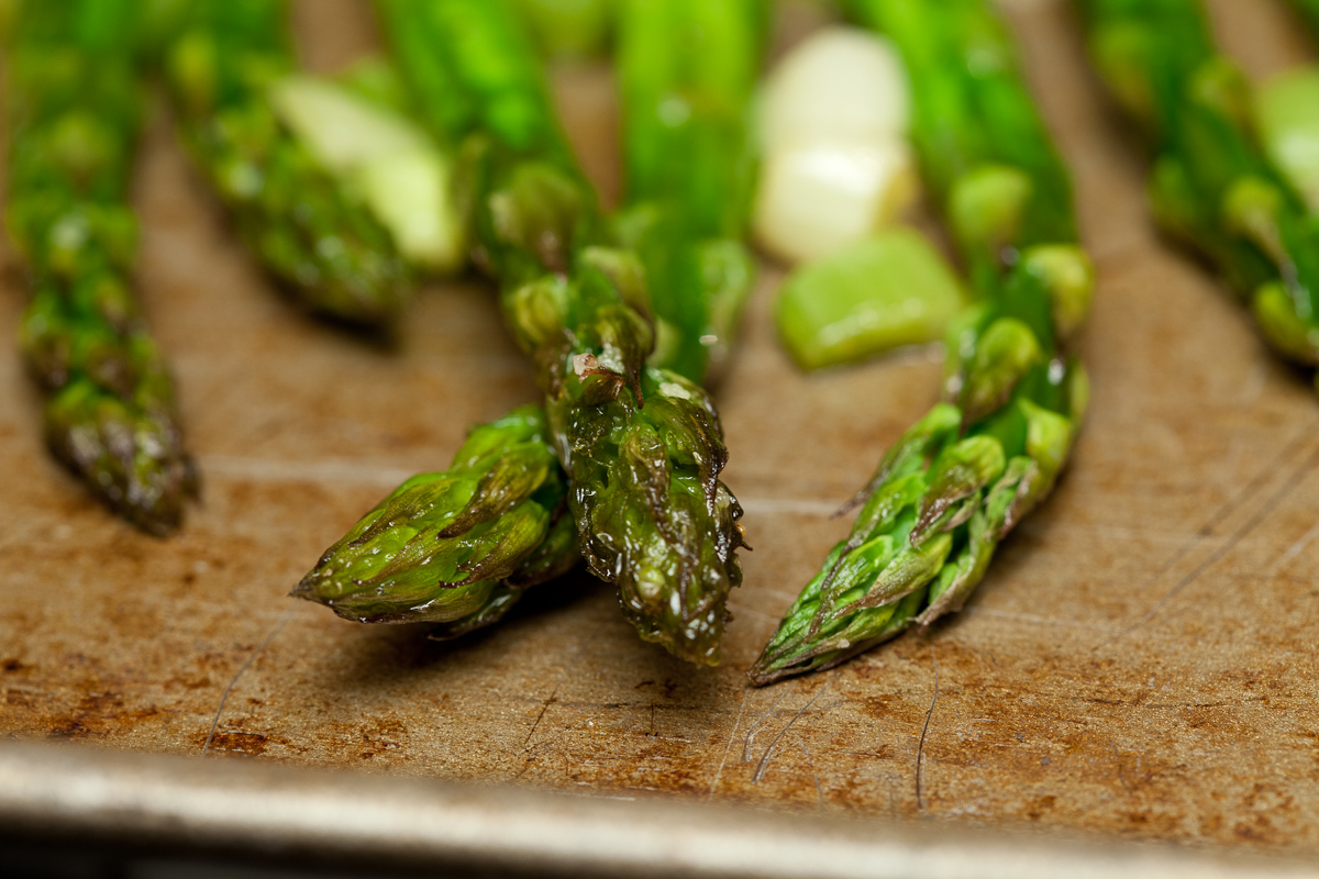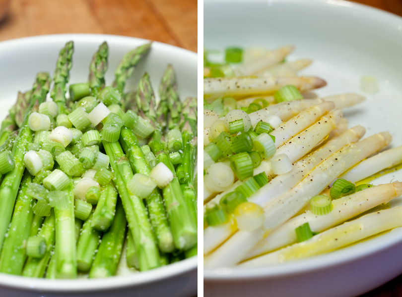 4. If you’re using white and green asparagus, treat them separately in the next steps.  Depending on their sizes, one will probably cook faster than the other.  Toss the vegetables with 3 tablespoons extra virgin olive oil and season with salt and pepper. Arrange on sheet pans in a single layer and put on a rack in the middle of the oven.  (Ignore the parchment paper on the sheet pans in the photographs.  We tried it and found the asparagus doesn’t brown as well.) Roast until golden brown and tender, 8-10 minutes.