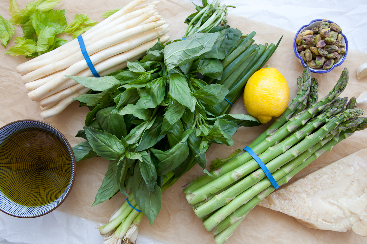 We eat A LOT of asparagus.  I see it on sale, buy an armful, steam it lightly, then use it to fill out other things–steel-cut oats and an egg, lunch salad with cannelloni beans, a way to gussy up a croque monsieur so I don’t feel like Lonely Guy eating grilled cheese in an empty house.  But Roasted Asparagus with Pistachio Pesto is something else altogether.  You set this platter in front of friends who aren’t afraid of getting a little messy when everyone’s standing around in the kitchen with a beer (my preference with asparagus, by the way)* or glass of wine, carrying on while you cook.  Serious finger food.