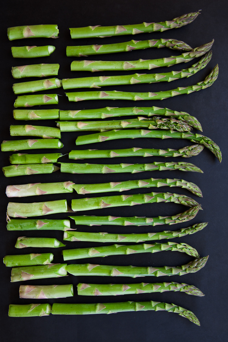 1. If the asparagus are fat, snap off the fibrous portion off the root end of the stems. Peel the the stem. If the asparagus are pencil thin, snap the ends but don’t bother with the peeling.  If they’re somewhere in between, it’s up to you–I do peel the medium ones.