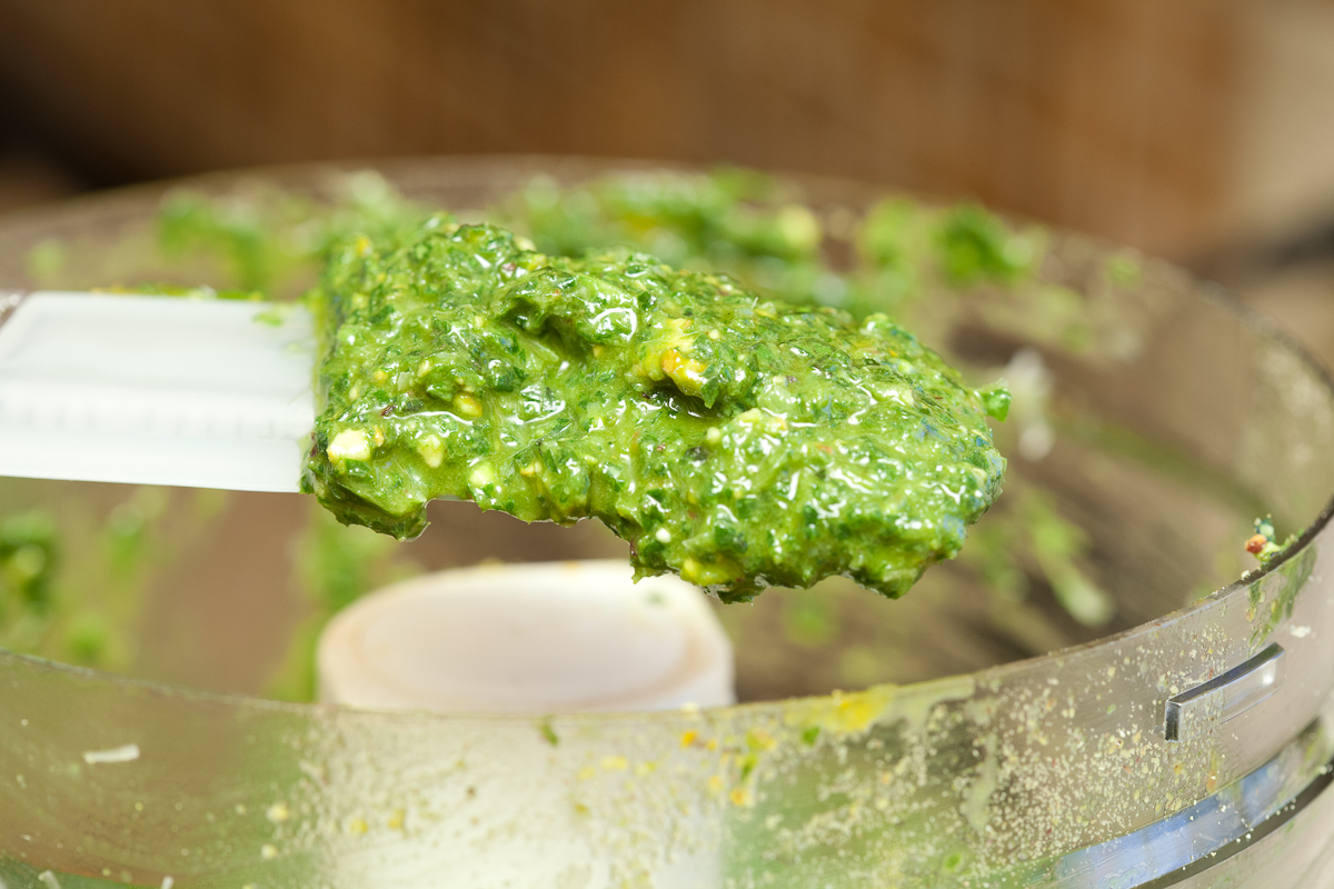 A note on pesto:  Basil starts to oxidize and darken quickly once it’s chopped and exposed to air (note the difference in color in the photos of the pesto on the spatula and the pesto spread on the platter).  If you put pesto in a bowl immediately after making it and cover it with a thin layer of olive oil it will remain bright.  In my restaurants, we blanch the basil before making pesto (blanched basil doesn’t darken quickly).  At home I usually don’t bother–the flavor is unaffected–but if you want durable brilliant green pesto, blanch the basil first.