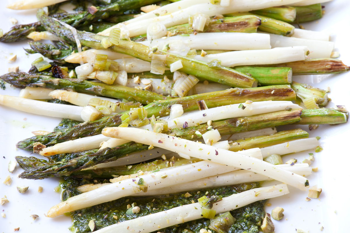 5. To serve, smear a generous portion of the pesto over the bottom of a platter.  Lay the asparagus on top.  Drizzle with lemon juice and additional olive oil if they seem dry.  Sprinkle with the remaining pistachios.  Serve extra pesto on the side.