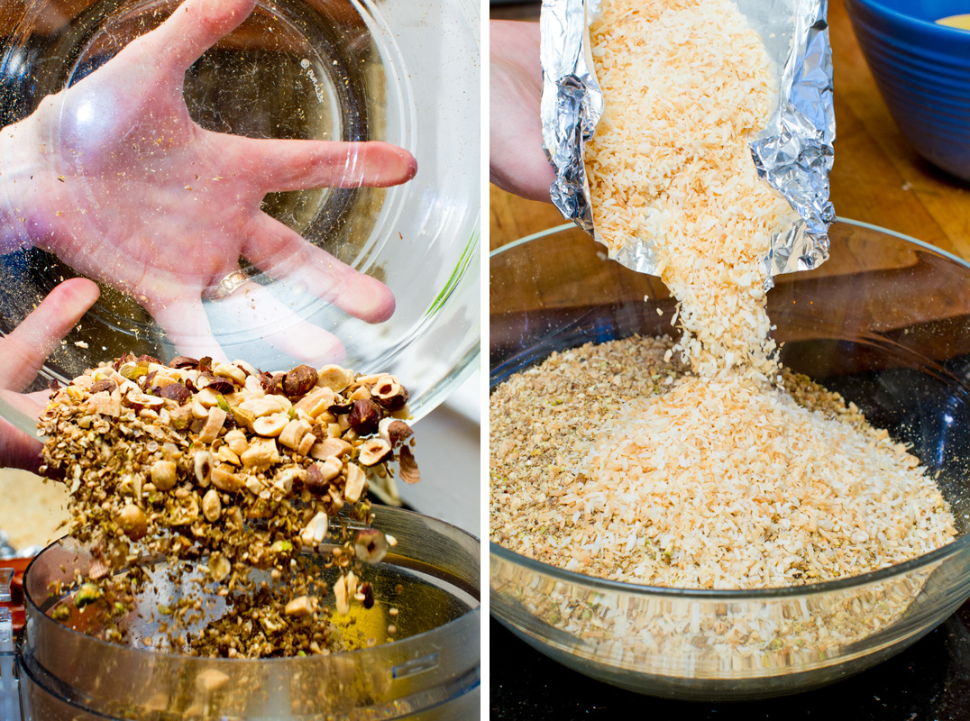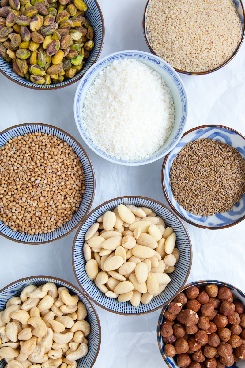 - Put the toasted coriander and cumin seeds in a food processor and pulse to chop coarsely. Stir this into the bowl with the nuts.