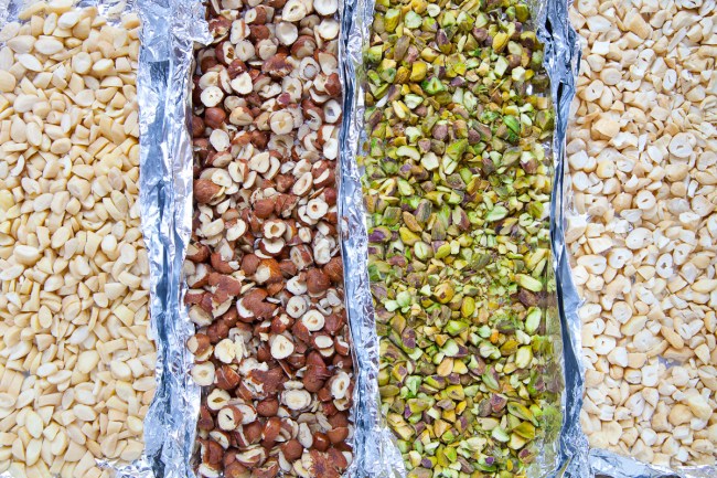 - Chop the pistachios, cashews, almonds and hazelnuts very coarsely, just enough that each whole nut is in 4 pieces. Put one variety of nuts into each of 4 boats and arrange on the first sheet pan. Toast 10-15 minutes, checking the nuts every 5 minutes or so. They’ll probably toast at different rates but pull them out as soon as the pistachios finish (they always seem to finish first). Let all the boats cool on a rack then dump the nuts in a bowl and toss well.