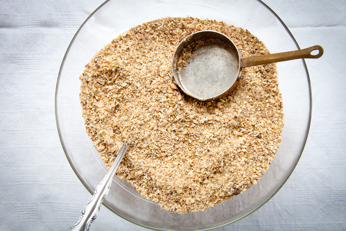 If you clicked on Ken’s link above you encountered a condensed dukkah recipe. I suggest you follow the steps here (which call for toasting the nuts and seeds in the oven instead of doing them in a skillet). The former is a more reliable way of making sure things toast evenly and don’t burn. It’s also easier to scale up or down according to how much you want to make.
