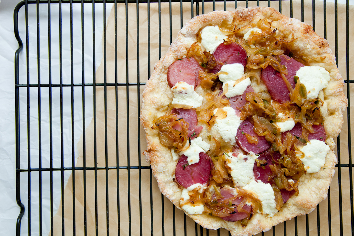 Easy Pizza with Sweet Onions, Spring Garlic, Cheese and Greens-6968