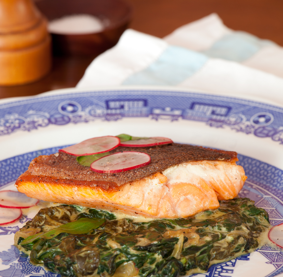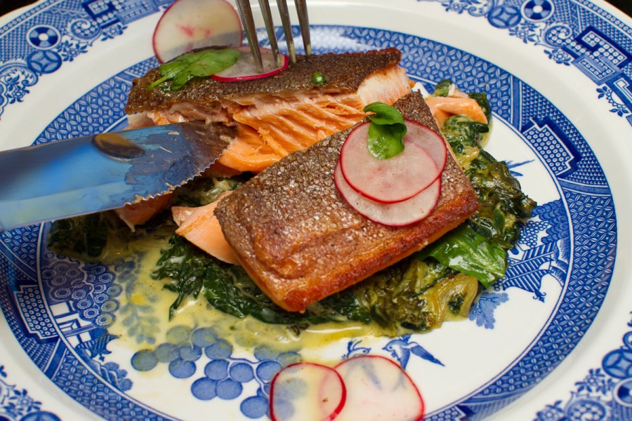 This is the easiest elegant dish you will ever make. Seared char with creamed spinach and sorrel. Despite my French introduction to cooking I’m not a fan of the just-add-butter-and-cream approach to life on the stove top. It’s too easy to lapse into a dish whose primary flavors are cream and butter rather than the ingredients you brought home from the store. Nevertheless, there are combinations that ask for butter and cream. Salmon, spinach and sorrel is one of them.