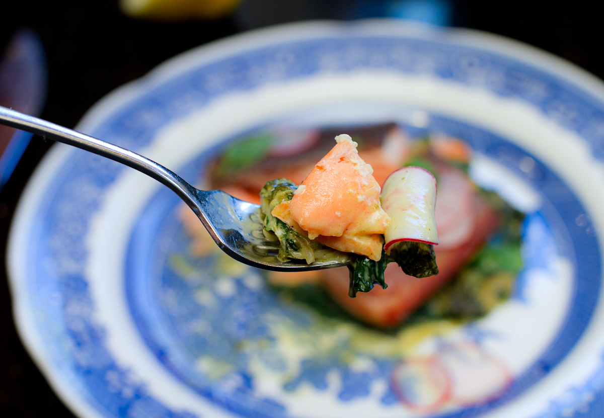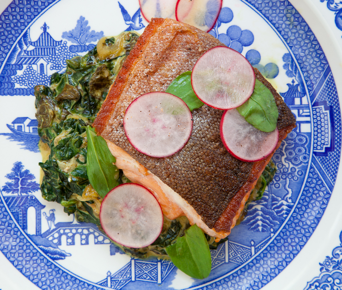 This stovetop method results in a piece of fish with a crisp skin and delicate flesh. It’s worth the wait. The radishes provide a crunchy, sharp counterpoint to the rich softness of the greens and fish.