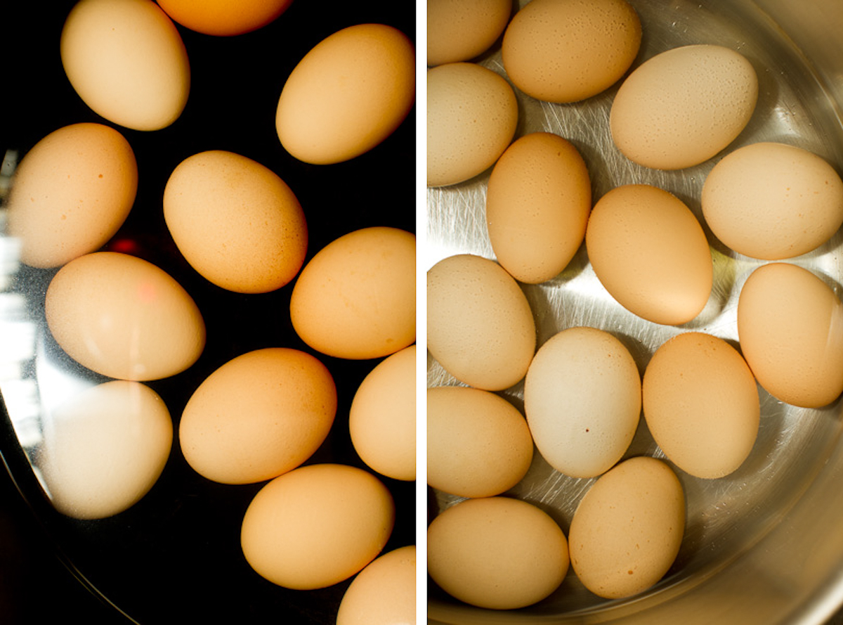 The most foolproof way I know of hard-boiling and then peeling eggs is to put them into a pot in a single layer, cover them with cold water by several inches and set them over high heat.  As soon as the water starts to boil, turn the heat off, cover the pot and let them sit for 15 minutes.  Transfer the pot to the sink, pour off the hot water and run cold water into the pot.  Add ice if it’s convenient.  Take each egg in turn and keeping it immersed gently bang the big end against the side of the pot so the shell cracks, then pinch off a bit of the bottom shell.  Allow the eggs to remain immersed for another ten minutes, then peel.  If you’re lucky, water will have worked its way between the membrane and the surface of the egg and the shells will come off easier than they might otherwise.  The yolks should be a rich creamy yellow, but cooked, without any of the nasty greening of the yolk.