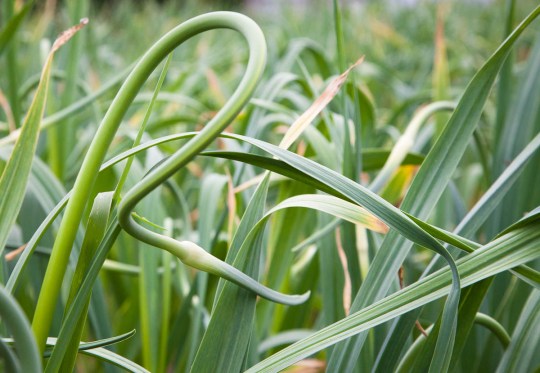 The world of garlic may be conveniently divided into hardneck and softneck varieties.  If you’ve ever bought a head of garlic and found the bulbs packed around a hard stiff stem, you’ve used hardneck garlic.  About a month after planting all garlic produces shoots, but only hardneck varieties produce the curlicue shoot with the pointed bulbil, or flower bulb, at the tip.  Although the bulbil doesn’t produce actual flowers, it does turn into a seed packet.  Typically the scape is cut so that the plant’s energy goes into the bulbs instead of the green Six Flags loop de loop of a scape.  The hard stem you find at the center of some bulbs is what’s left of the scape.