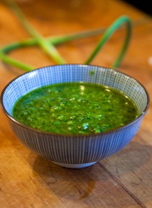 4. Combine the remaining ¼ cup scapes, parsley and pine nuts in the bowl of a food processor with the olive oil.  Puree until smooth.  Season to taste with salt.