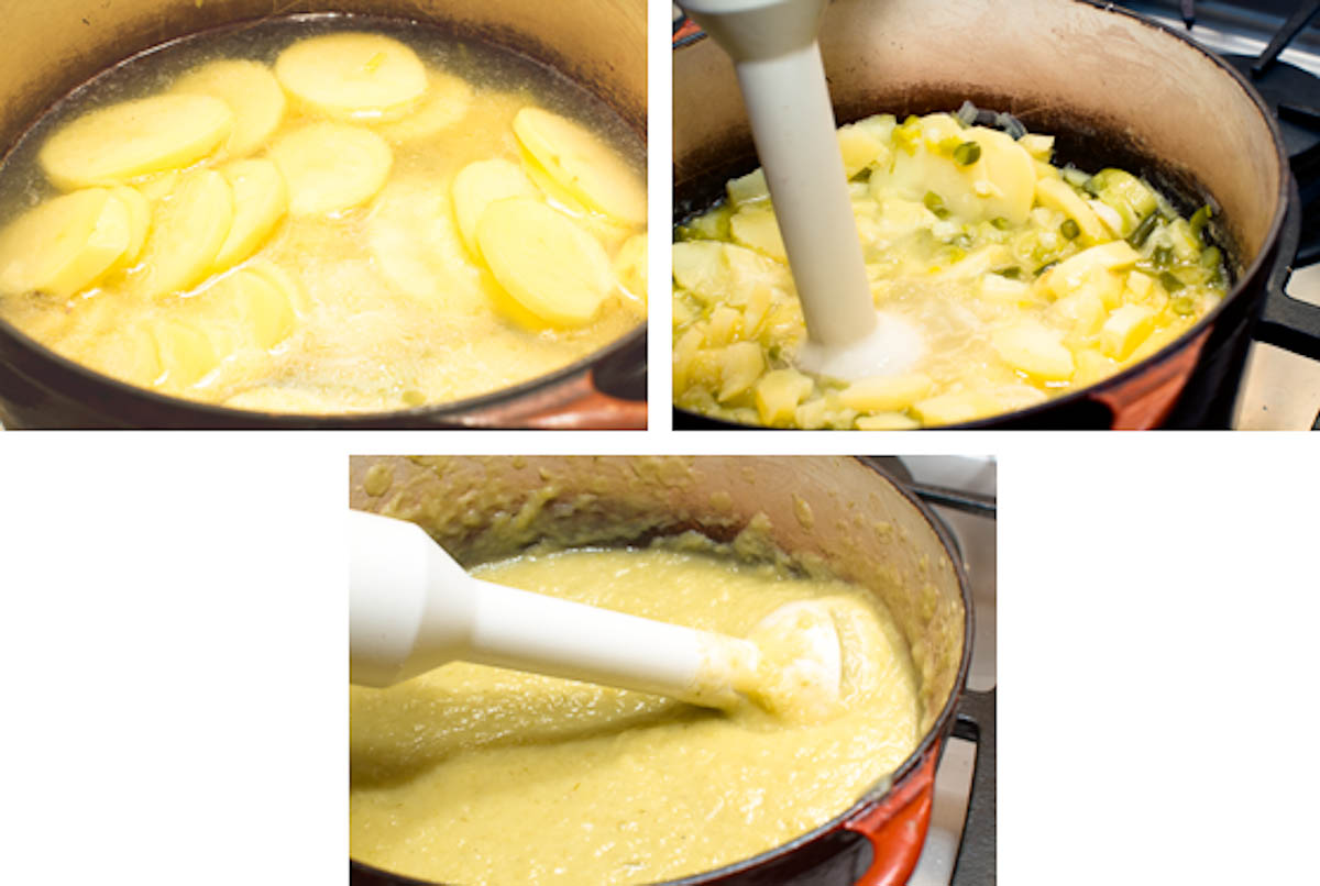 2. Add the potatoes and the chicken stock, increase the heat to medium-high, bring to a boil and then reduce the heat so the stock simmers.  Cook 30 minutes or until the potatoes are tender.  Puree with a hand held blender or in a food processor.