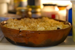 My tastes in dessert are embarrassingly retrograde.  Nothing fancy pants.  I’m like the guy in a suit who can barely box-step, gawping from the periphery of the dance floor at everyone else’s fancy footwork.  Lined end to end, my favorite desserts would resemble the bit players in a movie about bistro or trattoria food from the fifties and sixties–crème caramel, crème brûlée, chocolate mousse, flourless chocolate torte, lemon tart–along with an array of treats that you might find on somebody’s death row last meal–cherry, peach or blackberry crumble or cobbler, pies–glorious pies, all kinds, but especially wild blueberry–homemade pudding, glistening jello molds with fruit suspended inside, strawberry shortcake.  I’d add homemade walnut cinnamon rolls, except they’re not dessert.  This week’s subject, unlike a few of the items above, requires no special expertise.  Make the fruit filling, dollop it with the biscuity topping.  Bake.  It may be simple, but it’s as primally satisfying as a rope swing beneath a shaded tree on a summer afternoon.