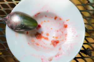 4. Put teaspoons of the topping evenly over the fruit.  Sprinkle with the turbinado sugar.  Refrigerate for 30 minutes.