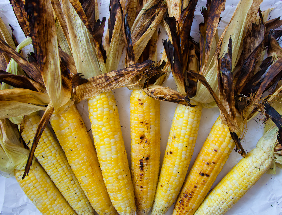 We don’t bother soaking or husking corn before grilling. Corn grilled in husk tastes smokey, duh, from its charred wrapper, and it’s got a hint of chewiness. Soaking corn works against both of those. The only time I’d make an exception is if you’re setting up shop on a ocean beach. Soaking in seawater really does add a briny element. Ears with larger kernels seem to take to the grill better than those with smaller ones. I much prefer Butter-and-Sugar, for example, than Silver Queen. As it happens, I like yellow corn, perhaps because I grew up in Michigan, not New England, where white corn is preferred, but regional inclinations aside, Silver Queen these days often tastes too sugary, without a lot of corn flavor.