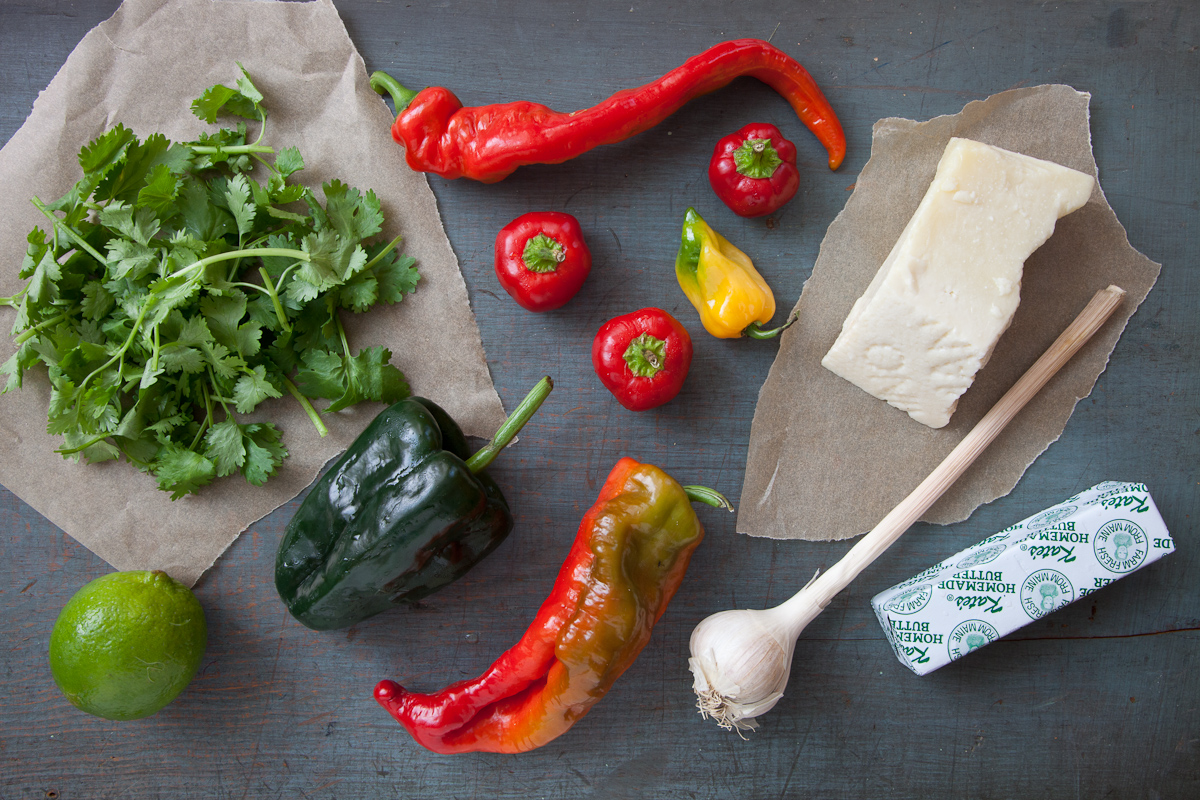 I’m still in the mood for butter. We talked about a grilled pepper compound butter, but I couldn’t get the Mexican roasted corn-mayo-cheese combination out of my head, so I just stole the cheese and put it right into the butter. It’s awesome. It has to be a sharp spicy cheese like Pecorino Romano to stand up to the bold flavors of peppers and cilantro. We also tried it on grilled swordfish. (It worked.)