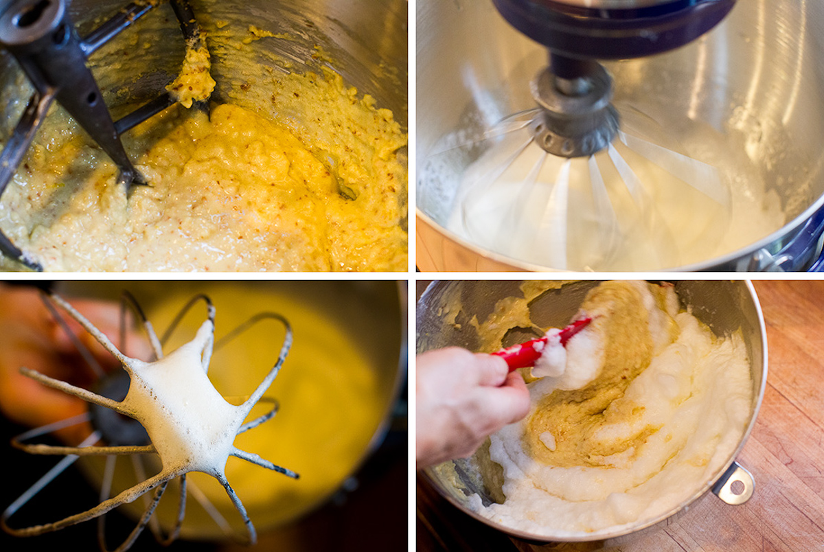 • No, I don’t think so. Is separating eggs complicated? That’s about as wild technically as it gets. There are a few places where you need to pay attention–about the same level of attention that you use to avoid burning a piece of toast (when you’re toasting the coconut flakes, when you’re running the peaches under a broiler). The hardest (and simplest) hurdle for beginners making a cake is to resist overbeating the batter. When Jody says to mix just until things are combined, then that’s what she means. A lot of people want to beat a cake batter until it’s perfectly smooth, everything perfectly mixed. That’s a mistake. Just beat it until everything more or less comes together–no dry spots, no big smears of egg–and then that’s enough. Look at the photo of our batter, there are probably a few lumps in there. If you do overbeat it, that’s okay too. The cake won’t have as delicate a texture, but it will taste fine, and I can guarantee that if there’s some leftover for toast the next day no one–absolutely no one–will complain. Everybody should overbeat a few cakes in their lives, just so they learn to trust themselves to beat it just enough. Go ahead, give it a shot–you can do it! (And roasted peaches make up for a lot of other errors.) ;-) Ken